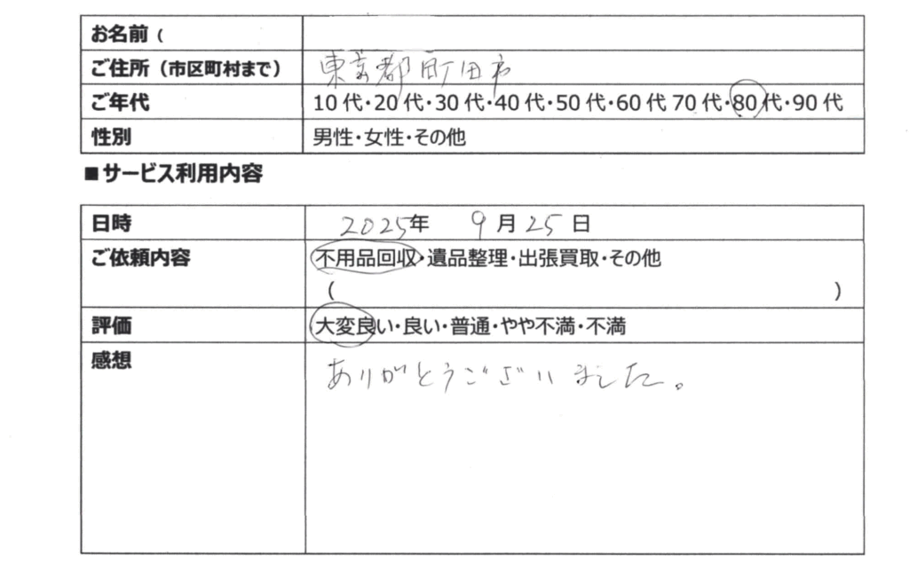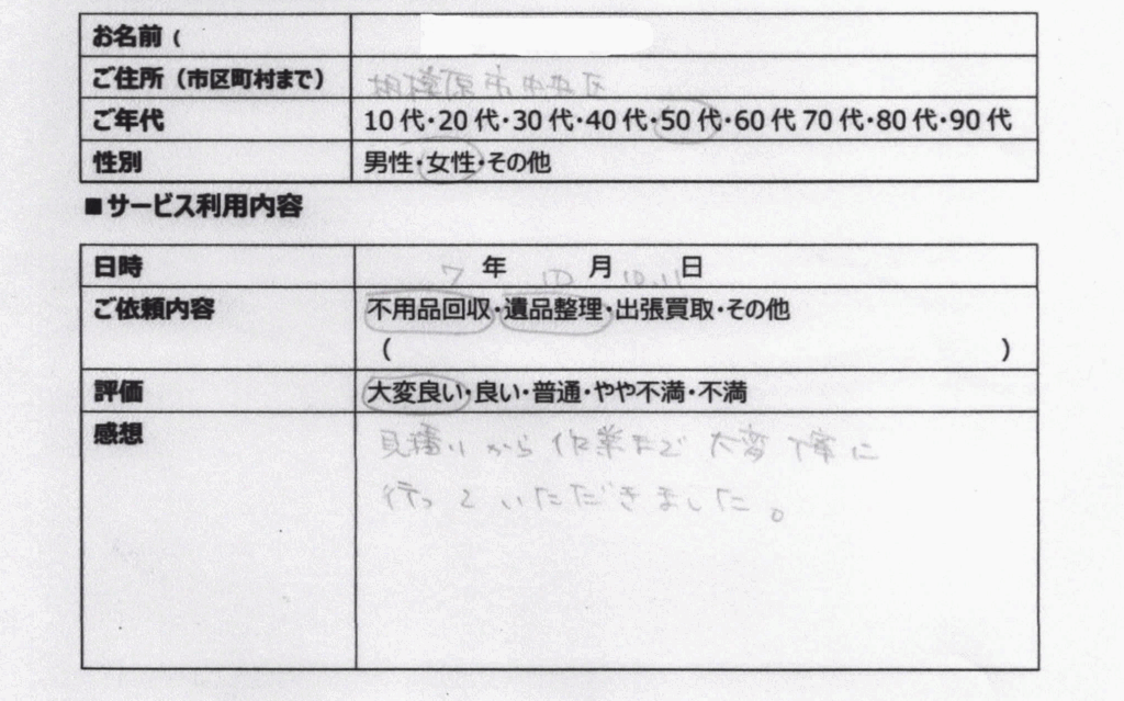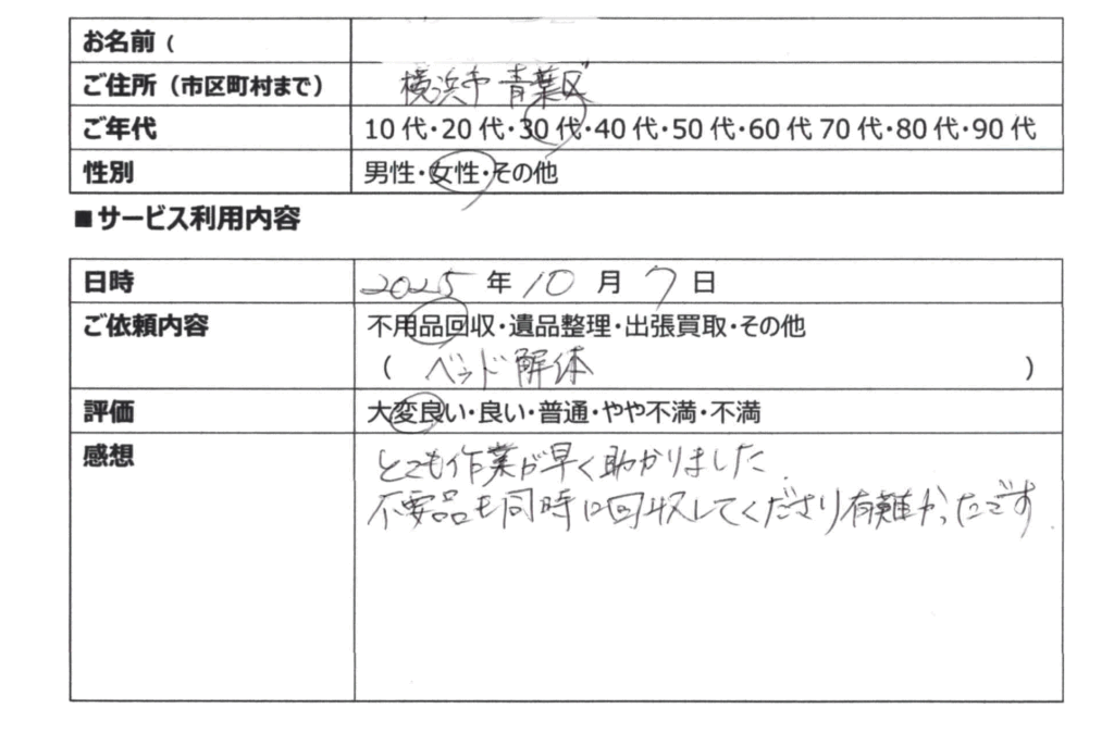 とっても作業が早く助かりました。不用品も同時に回収してくださり、有難かったです。